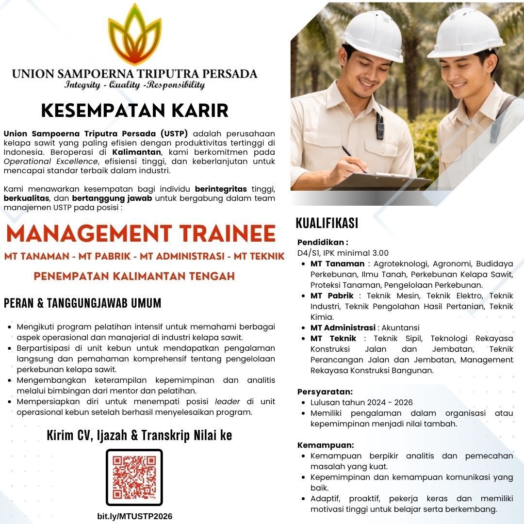 Kesempatan karier terbuka!PT Union Sampoerna Triputra Persada (USTP) membuka program Management Trainee 2026 untuk kamu yang siap berkembang dan berkarier di industri kelapa sawi...
